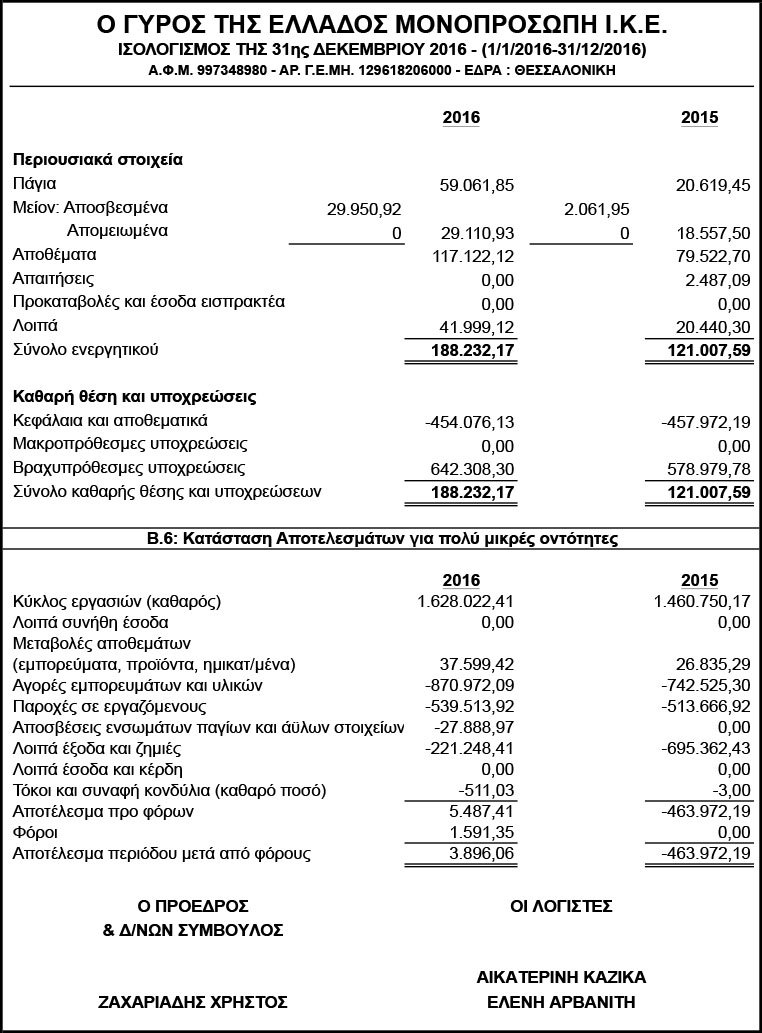 ΕΠΩΝΥΜΙΑ: Ο ΓΥΡΟΣ ΤΗΣ ΕΛΛΑΔΟΣ ΜΟΝΟΠΡΟΣΩΠΗ Ι.Κ.Ε. ΑΦΜ: 997348980 ΓΕΜΗ: 129618206000 ΔΙΕΥΘΥΝΣΗ: ΒΑΦΟΠΟΥΛΟΥ 27 - TK 54646 - ΘΕΣΣΑΛΟΝΙΚΗ ΕΤΑΙΡΙΚΟ ΚΕΦΑΛΑΙΟ: 54.000,00 € ΔΙΑΧΕΙΡΙΣΤHΣ: ΖΑΧΑΡΙΑΔΗΣ ΧΡΗΣΤΟΣ ΕΤΑΙΡΟΣ: ΖΑΧΑΡΙΑΔΗΣ ΧΡΗΣΤΟΣ